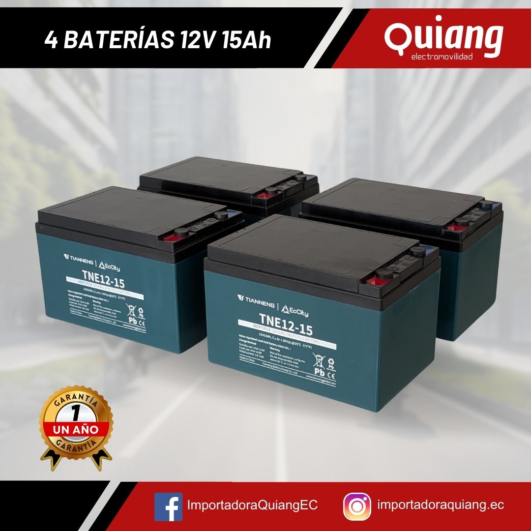 ¿Necesitas 4 Baterías 12V15Ah? Si tu moto eléctrica es de 48V, es muy probable que este sea el pack que necesitas. Importante: si tus baterías actuales son de 12V12Ah, ¡puedes cambiarlas por estas sin problema! Tienen las mismas medidas y no necesitas modificar nada en tu moto. De hecho, obtendrás una autonomía adicional con el mismo espacio.