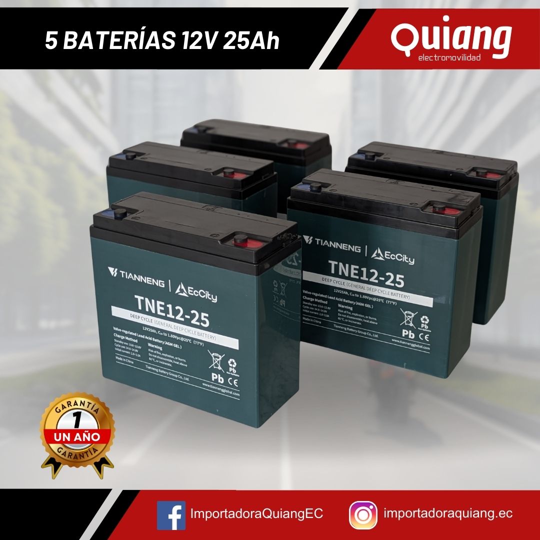 ¿Necesitas 5 Baterías 12V25Ah? Si tu moto eléctrica es de 60V, es muy probable que este sea el pack que necesitas. Importante: si tus baterías actuales son de 12V20Ah, ¡puedes cambiarlas por estas sin problema! Tienen las mismas medidas y no necesitas modificar nada en tu moto. De hecho, obtendrás una autonomía adicional con el mismo espacio.